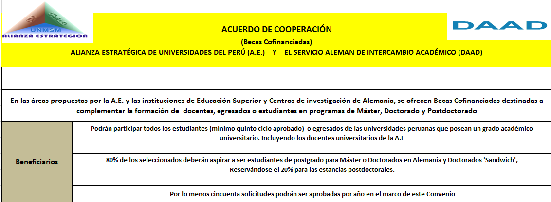 Se pone en conocimiento que el Programa de Becas Académicas o Crédito Educativo a Europa Alemania, España, Italia y Japón. Que, mediante el acuerdo suscrito por los fundadores y el comité ejecutivo de la alianza estratégica formada por la Universidad Nacional Agraria la Molina, Universidad Mayor de San Marcos y la Universidad Nacional de Ingeniería, se acordó incorporar a la Universidad Privada de Tacna, como nuevo integrante de esta alianza, que le permitirá a partir de la fecha compartir las siguientes líneas de acción. Por lo tanto el Sr. Rector de la Universidad Privad de Tacna, da conocer es gran paso a la comunidad universitaria y a la población en general por tratarse de alianzas que van a generar un valor agregado a la formación de nuestros estudiantes.